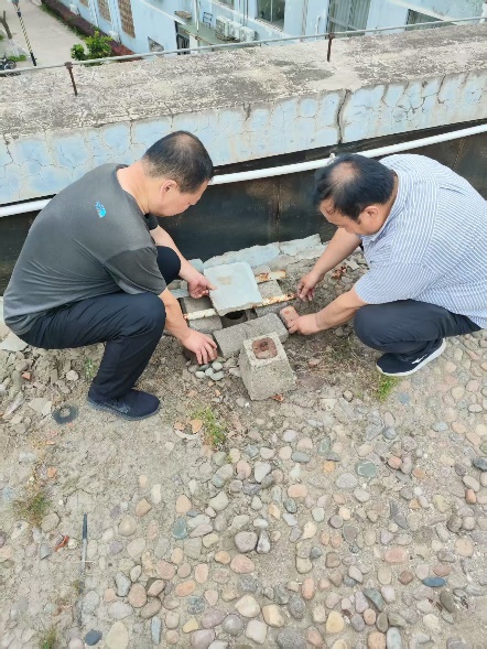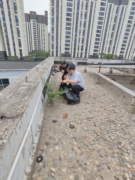 随后,鲁师傅和滕师傅对楼顶上的树叶、垃圾等杂物进行了清理,并对排水口进行疏通,同时采取了防止树叶再次堵塞的措施 。
